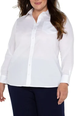 This Classic Button Front Shirt is a timeless piece! The stretch poplin and roomy fit will keep you comfortable all day. The perfect versatile shirt that can be worn with a blazer for work or casually with denim.DETAILS:30″ HPSClassic fitSpread Collar with button closureLong sleeves with button cuffsLeft front pocketRound hem detailModel is 5’9” wearing a 1XStyle #: LY8C95G52