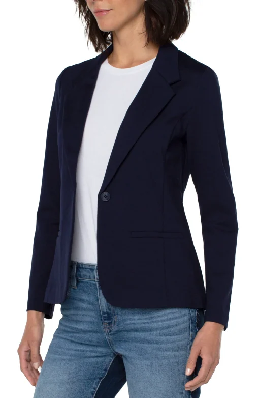 Okay, you need this! We call this “The Wear With Everything Blazer.” Instantly feel cool and sophisticated in this fitted knit blazer! Wear to work on business meetings with the matching trouser or keep it casual with denim and your favorite tee! Easy does it!DETAILS:26” High Shoulder PointAmazing stretch and comfortTwo front pocketsSleek fitted style Model is 5’9” wearing a SmallStyle #: LM1601M42