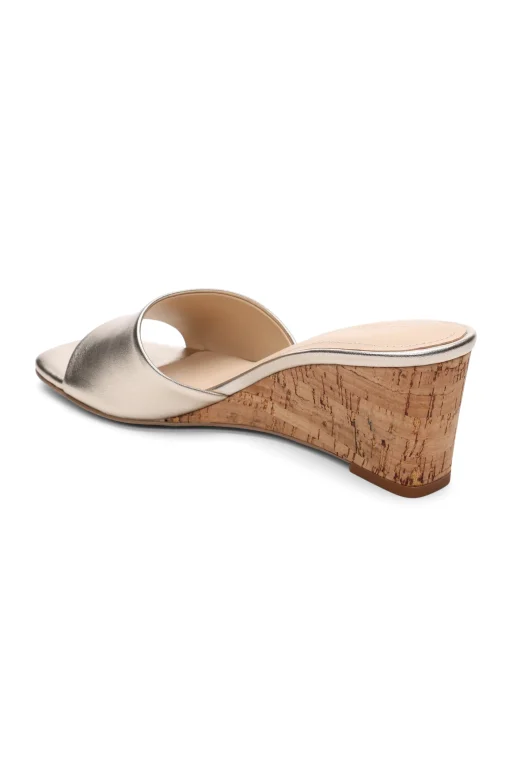 Our wedge mule features a cork-wrapped base for stability, combined with an elegant single-band slide design. Compliments any casual or dressy look with ease. DETAILS: 2.5″ WedgeSlideMetallic Sheep Nappa UpperPlatform wedge sandalCork covered wedgeLeather sock liningStyle #: 754029