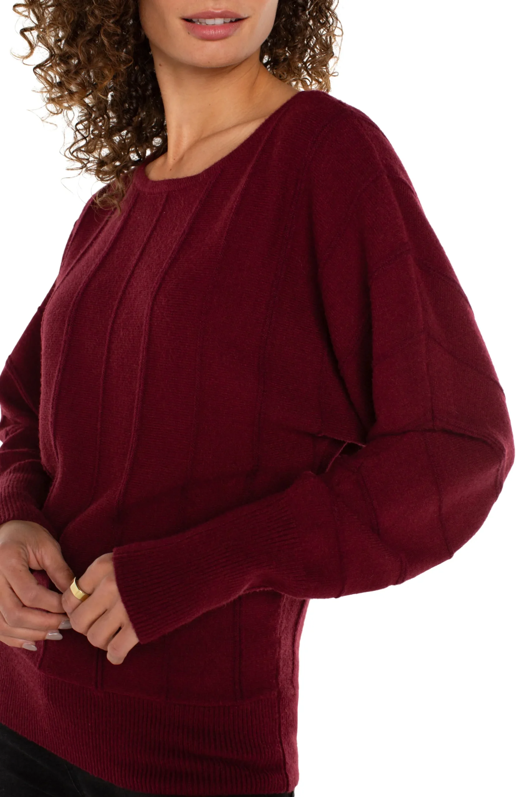 This versatile dolman sweater easily goes from casual weekends to office chic. Wear it with denim for a laid-back look, or pair it with trousers for a sophisticated ensemble. Whether you’re lounging at home or stepping out for a night on the town, this sweater is sure to be your go-to choice for style and comfort.DETAILS:24-1/2” High Shoulder PointLong sleeveVertical stripe detailCrew neckModel is 5’9” wearing a size smallStyle #: LM8B33SK11
