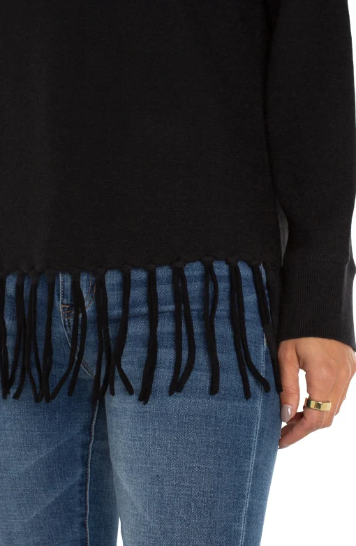 This sweater perfectly blends comfort and playfulness, with fringe around the bottom that adds charm and movement. Made from soft yarns, this sweater provides warmth while also maintaining a lightweight feel, making it ideal for layering during transitional seasons.DETAILS:22-3/4” High point shoulderLong sleeveBoat NeckFringe detailsModel is 5’9” wearing a size smallStyle # LM8D60SK44