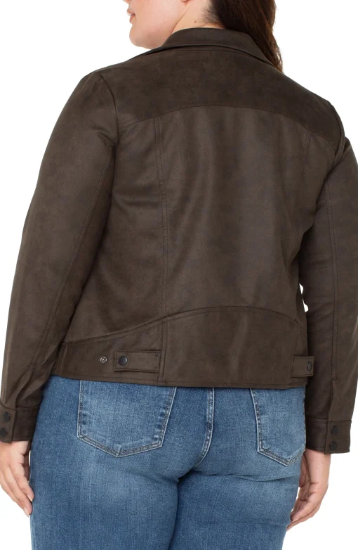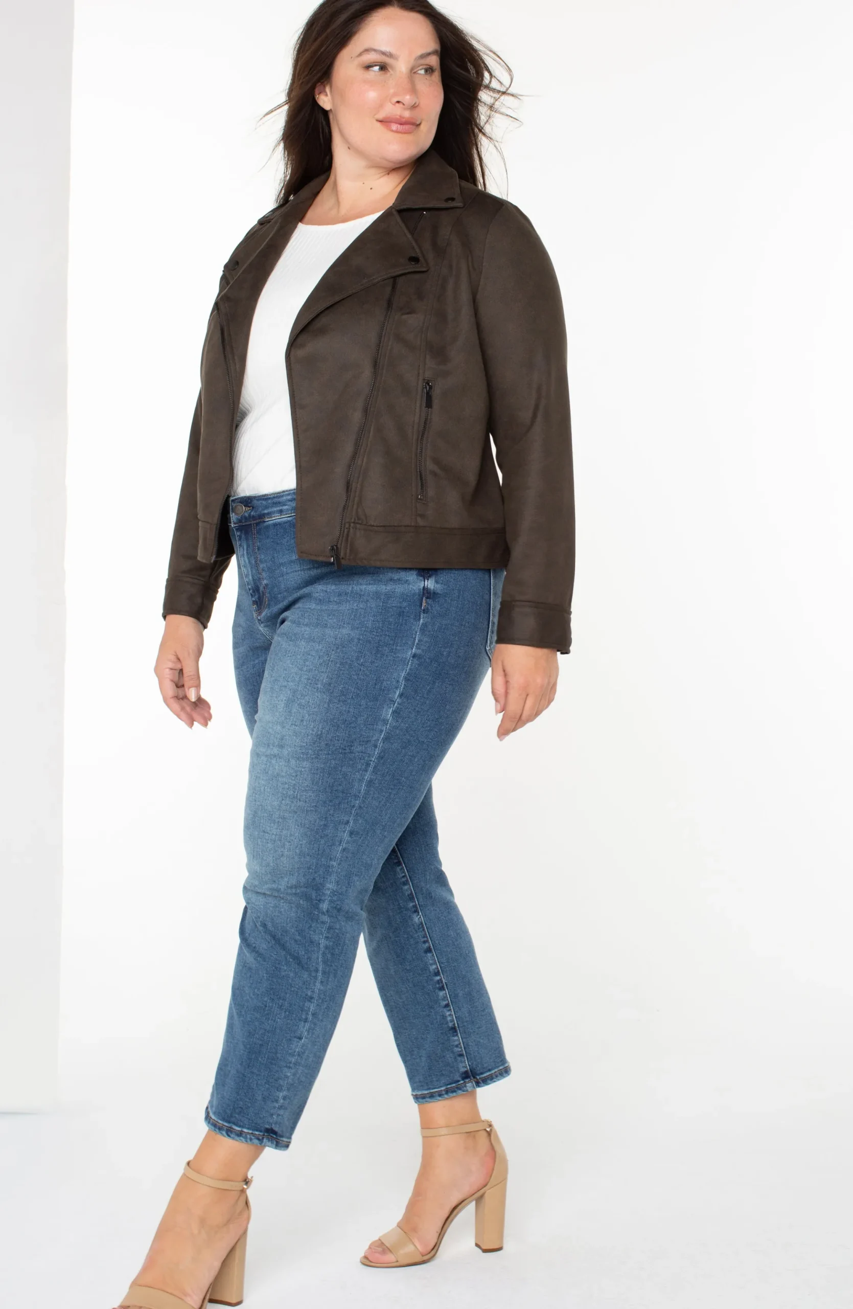 Our Olive Moto Jacket is super chic and cool, this jacket pairs well with denim or one of our stunning Kelsey Trousers! Wear with confidence… you will love how you feel! DETAILS:25-1/2” High Shoulder PointAsymmetric zip closureTwo zip pockets Classic moto lapelFaux suedeModel is 5’9” wearing a size 1XStyle #: LY1171T55