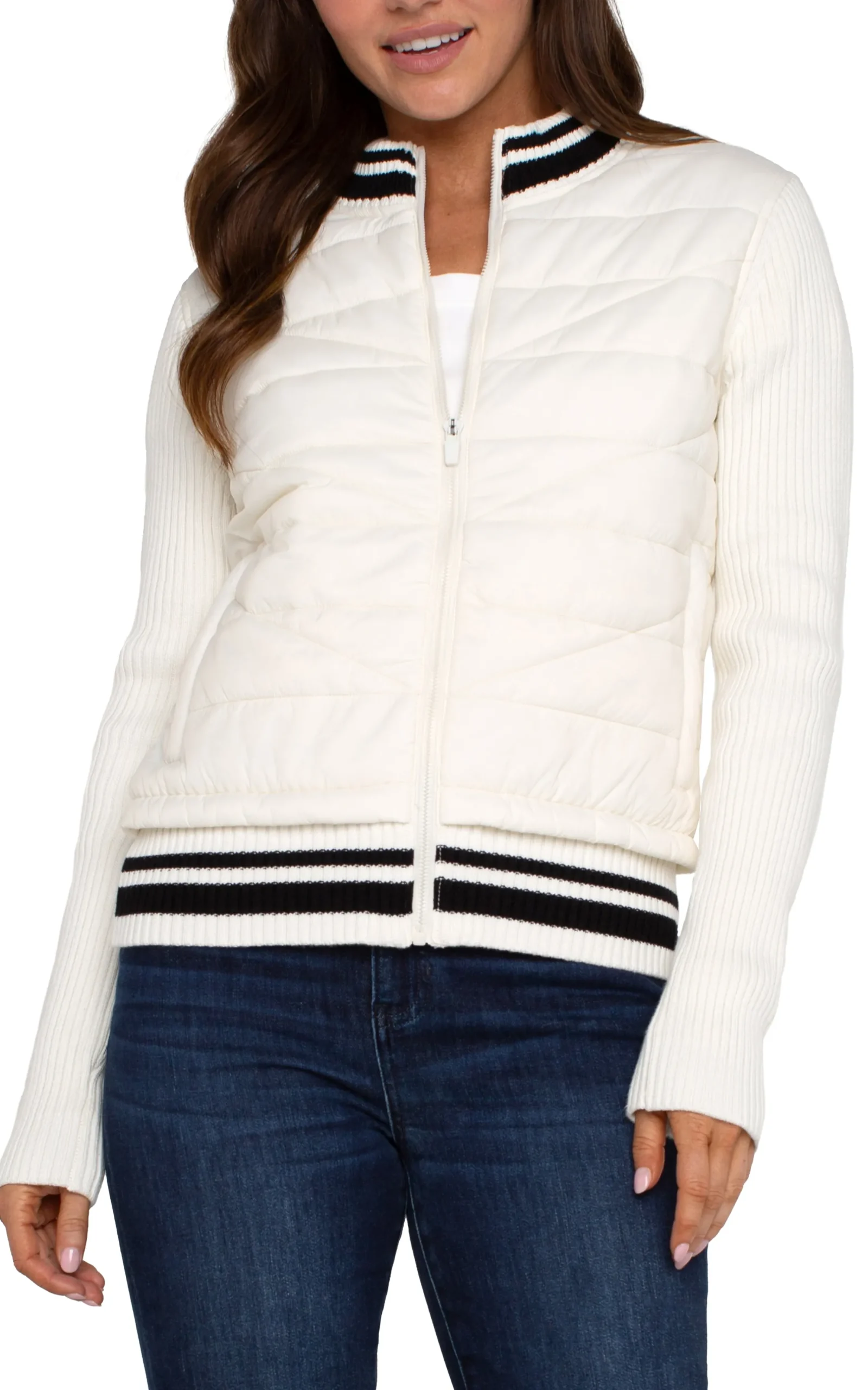 Step out in style with our easy-to-wear quilted sweater. Featuring striped rib details on the collar and hem for a sporty yet polished look. Pair it with your favorite denim and sneakers for a relaxed day around town.DETAILS:24” High shoulder pointFront zip closureTwo color rub cuff and hemWoven SateenModel is 5’9” wearing a size SmallStyle #: LM8D67SW53-S