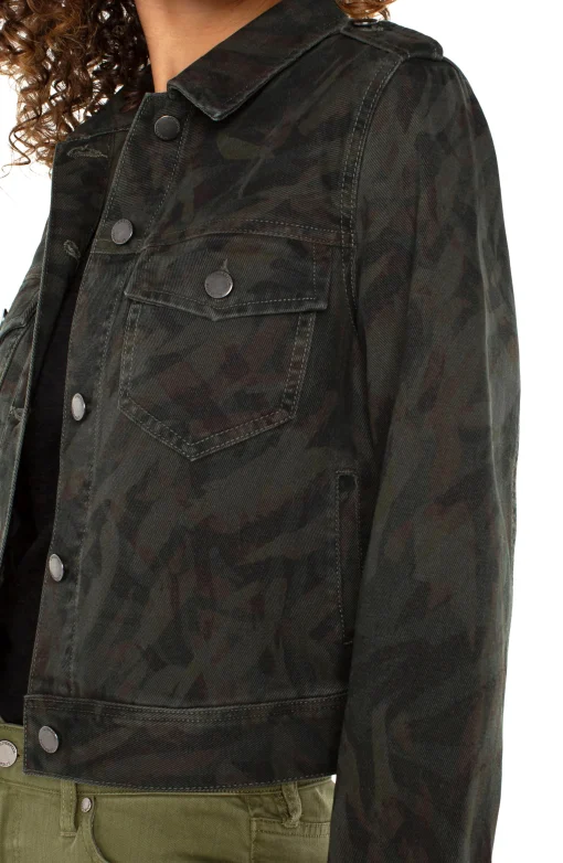 Crafted from premium denim in a deep, dark green camo print, this jacket exudes sophistication. The cropped silhouette offers a modern twist on a classic, accentuating your waist and adding a hint of femininity to your ensemble. DETAILS:21″ Front body lengthFront patch pocketsButton-front closureLong sleevesModel is 5’9” wearing a size smallStyle #: LM1025QE3P62