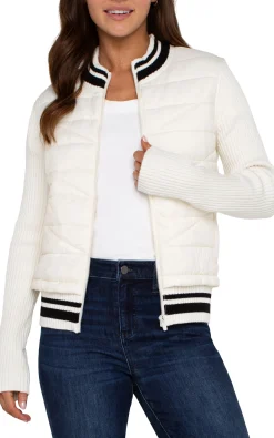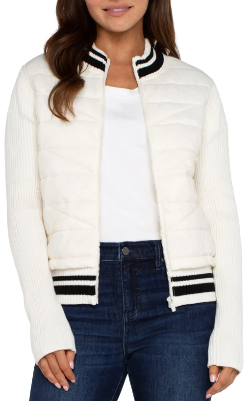 Step out in style with our easy-to-wear quilted sweater. Featuring striped rib details on the collar and hem for a sporty yet polished look. Pair it with your favorite denim and sneakers for a relaxed day around town.DETAILS:24” High shoulder pointFront zip closureTwo color rub cuff and hemWoven SateenModel is 5’9” wearing a size SmallStyle #: LM8D67SW53-S